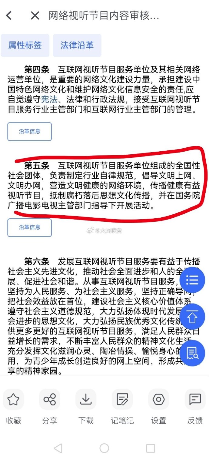 《互聯網視聽節目服務管理規定》第五條規定:互聯網視聽節目服務單位組成的全國性社會團體,負責制定行業自律規範,倡導文明上網、文明辦網,營造文明健康的網絡環境,傳播健康有益視聽節目,抵制腐朽落後思想文化傳播,並在國務院廣播電影電視主管部門指導下開展活動。(圖1)