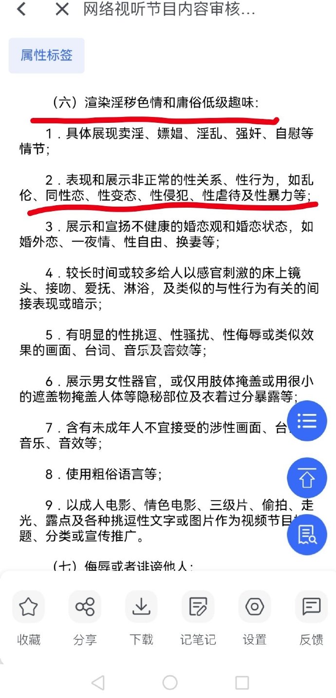 並且,互聯網視聽節目服務相關單位禁止製作、播放含有危害社會公德,擾亂社會秩序,破壞社會穩定,宣揚淫穢、賭博、吸毒,渲染暴力、恐怖,教唆犯罪或者傳授犯罪方法的網絡視聽節目。其中也包括表現和展示非正常的性關係、性行為,如亂倫、同性戀、性變態、性侵犯、性虐待及性暴力等內容。
