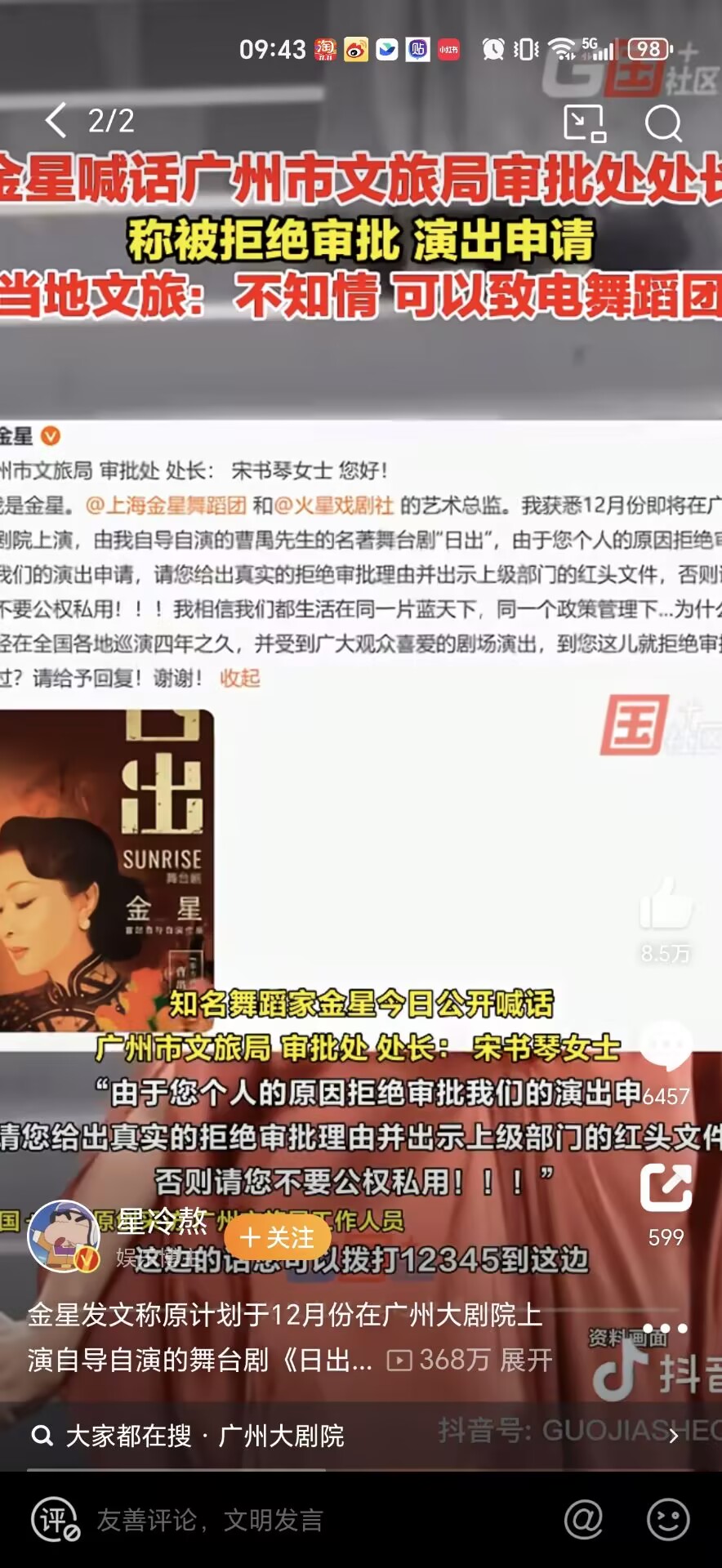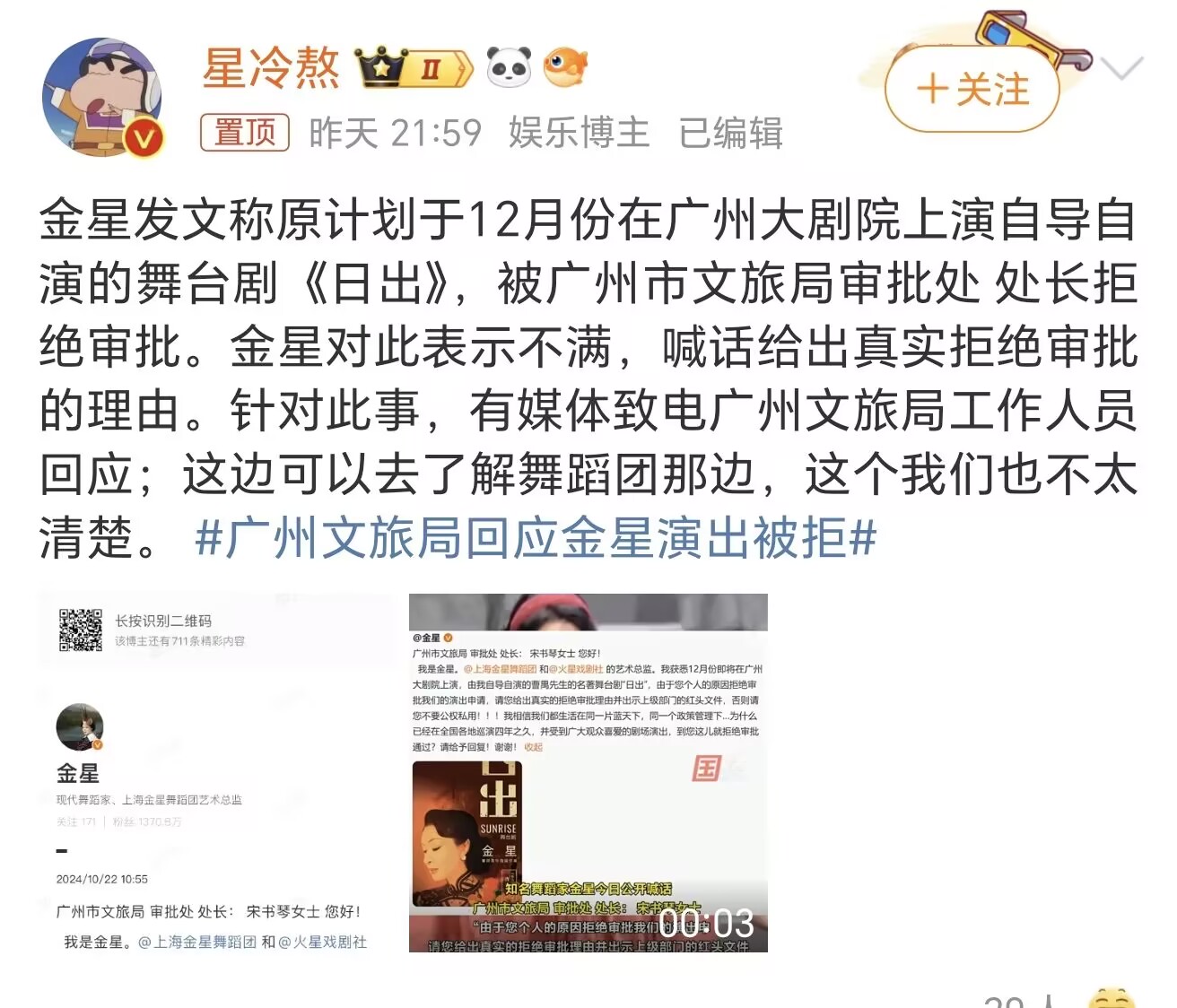 金星發文質問廣州市文旅局為什麼不審批自己的舞台劇,文旅局:你去問舞蹈區團吧_風聞