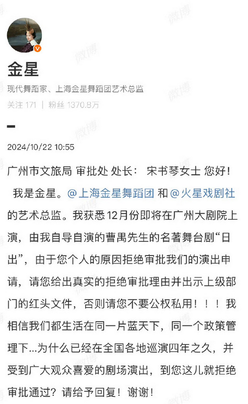 事情是這樣的,知名舞蹈家金星在10月22日的時候發了一篇文章,內容是質問廣州市文旅局審批處,為什麼不審批舞蹈團計劃於12月份在廣州大劇院上演的舞台劇 《日出》。