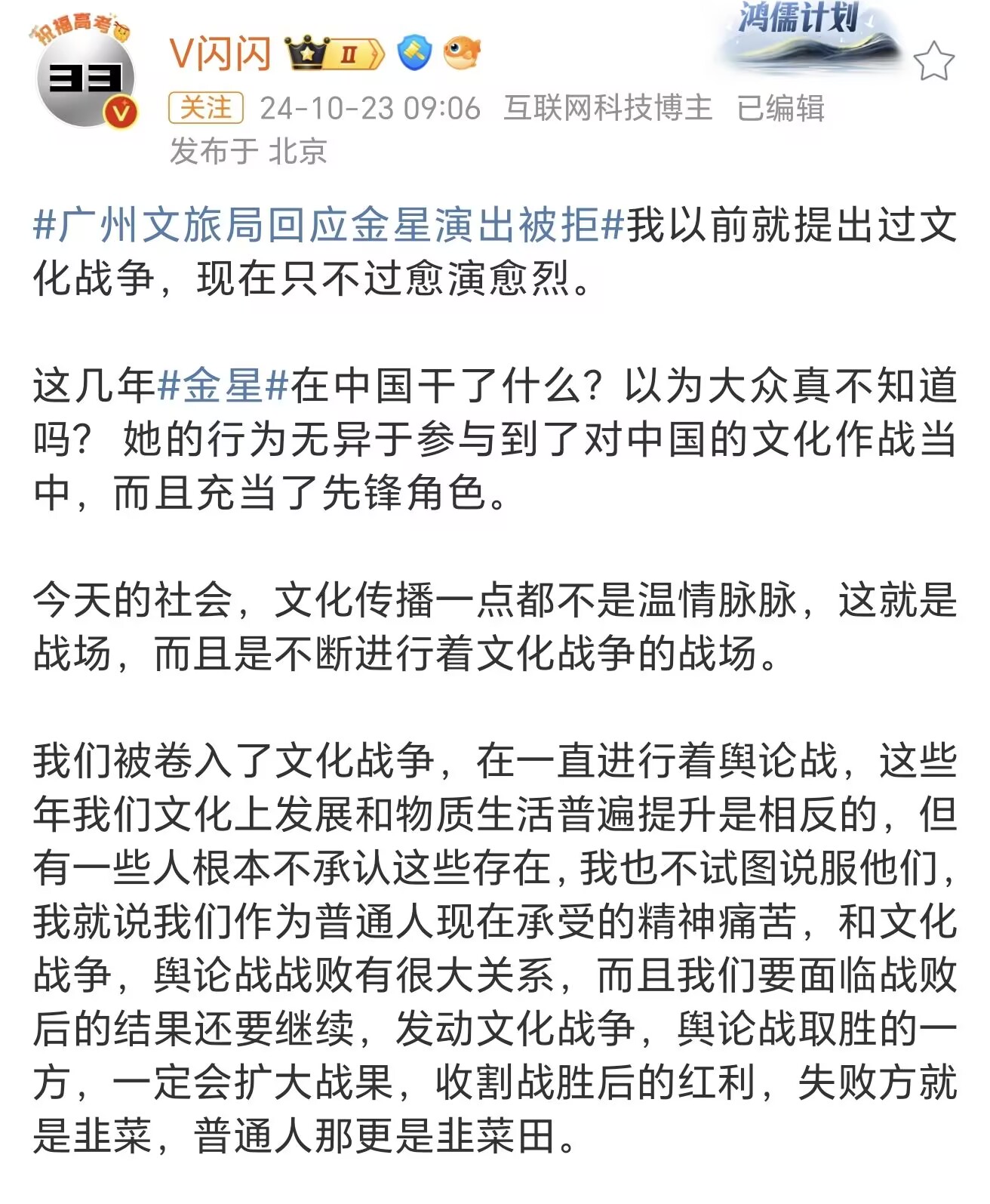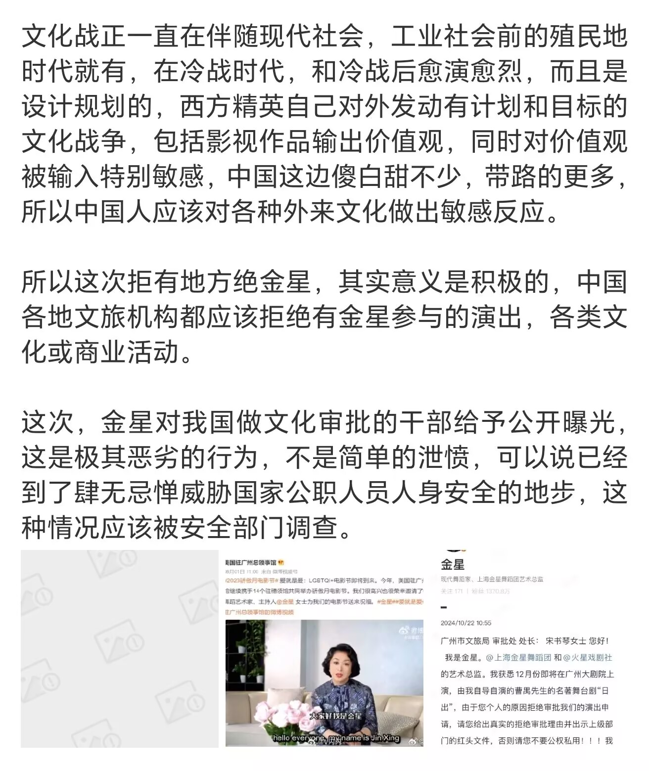 也有大V認為,金星的行為無異於參與到了對中國的文化作戰當中,並且還充當了先鋒角色。