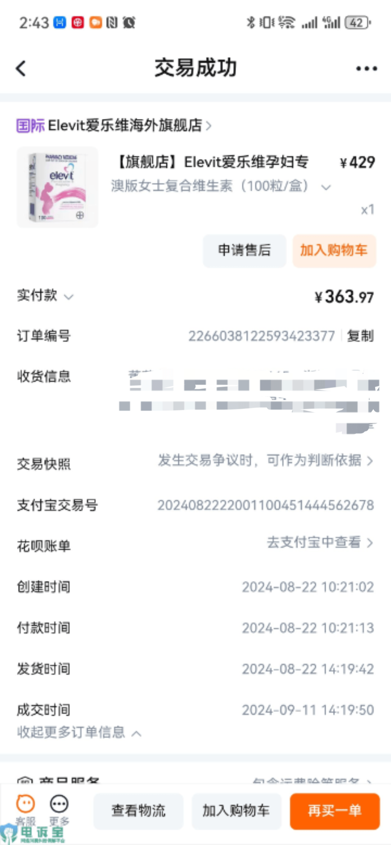 10月20日,浙江省的童女士向“電訴寶”投訴稱其於8月22日在天貓國際的愛樂維海外旗艦店購買了一款名孕婦專用複合維生素葉酸產品,該產品宣稱適用於全孕期。然而,童女士在服用該產品後發現自己的胎兒出現了畸形情況並引產。