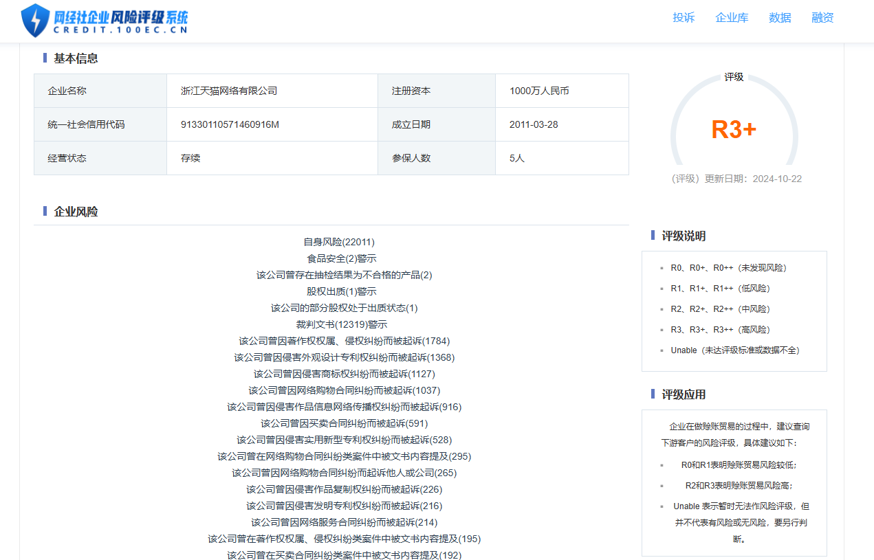 據“網經社企業風險評級系統”顯示,天貓國際隸屬的浙江天貓網絡有限公司的風險評級為R3+,公司目前所處高風險。