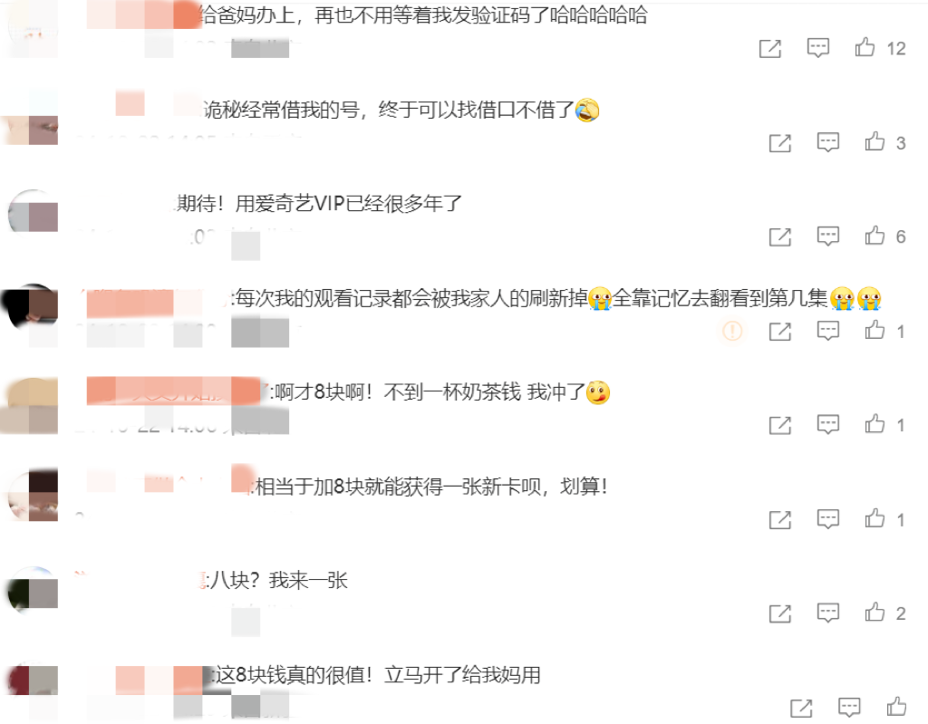 這一方式,給過去習慣共享密碼使用的用户們提供了一個解決既有需求的出口,會員用户可以用更低的價格帶動家人朋友們一起加入追劇綜的行列,並且,由於獨立賬號互不干擾,甚至比從前賬號共享時更加方便。在評論區裏不少用户提到,“給爸媽辦上,再也不用等着我發驗證碼了”“每次我的觀看記錄都會被我家人的刷新掉,全靠記憶去翻看到第幾集” 。