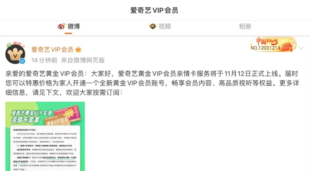 今天愛奇藝表示將推出“黃金VIP會員親情卡服務”,以解決用户這一老大難的痛點。黃金VIP會員可加8元開通一個全新會員賬號,愛奇藝親情賬號開通和續訂均由主賬號統一付款。也就是説今後家裏一個人開了愛奇藝黃金會員,就有了一個可以低價為家人再添一個會員卡的機會。