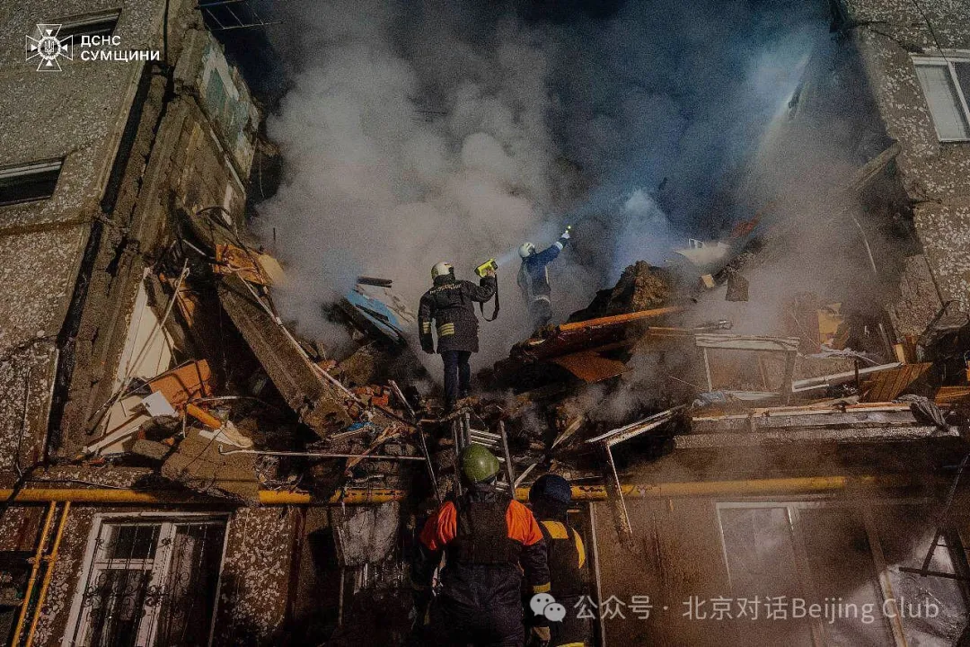 當地時間3月13日,烏克蘭蘇梅州,緊急服務人員在一棟被俄羅斯襲擊摧毀的公寓樓裏工作(圖源:視覺中國)
