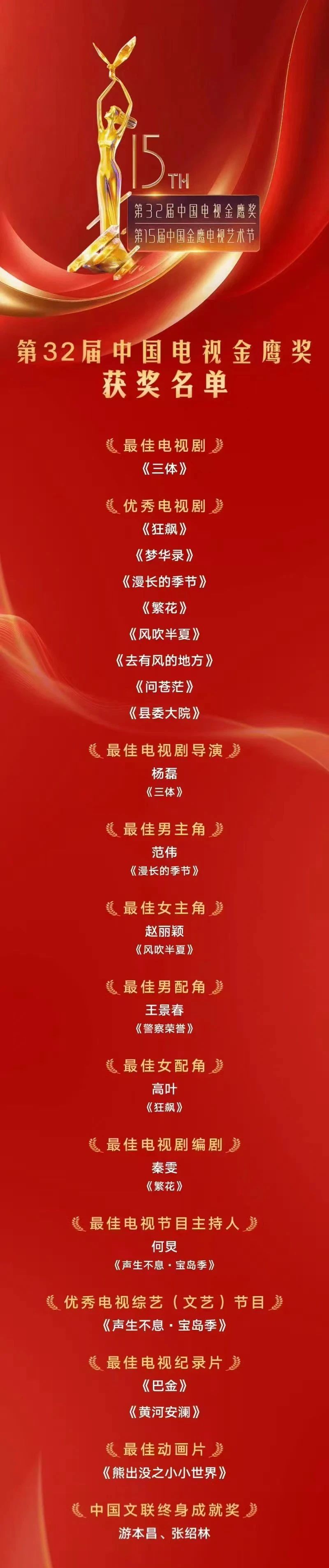 此外,楊磊憑藉《三體》摘得最佳電視劇導演獎;秦雯憑藉《繁花》獲得最佳電視劇編劇獎。演員遊本昌,導演張紹林獲得中國文聯終身成就獎。