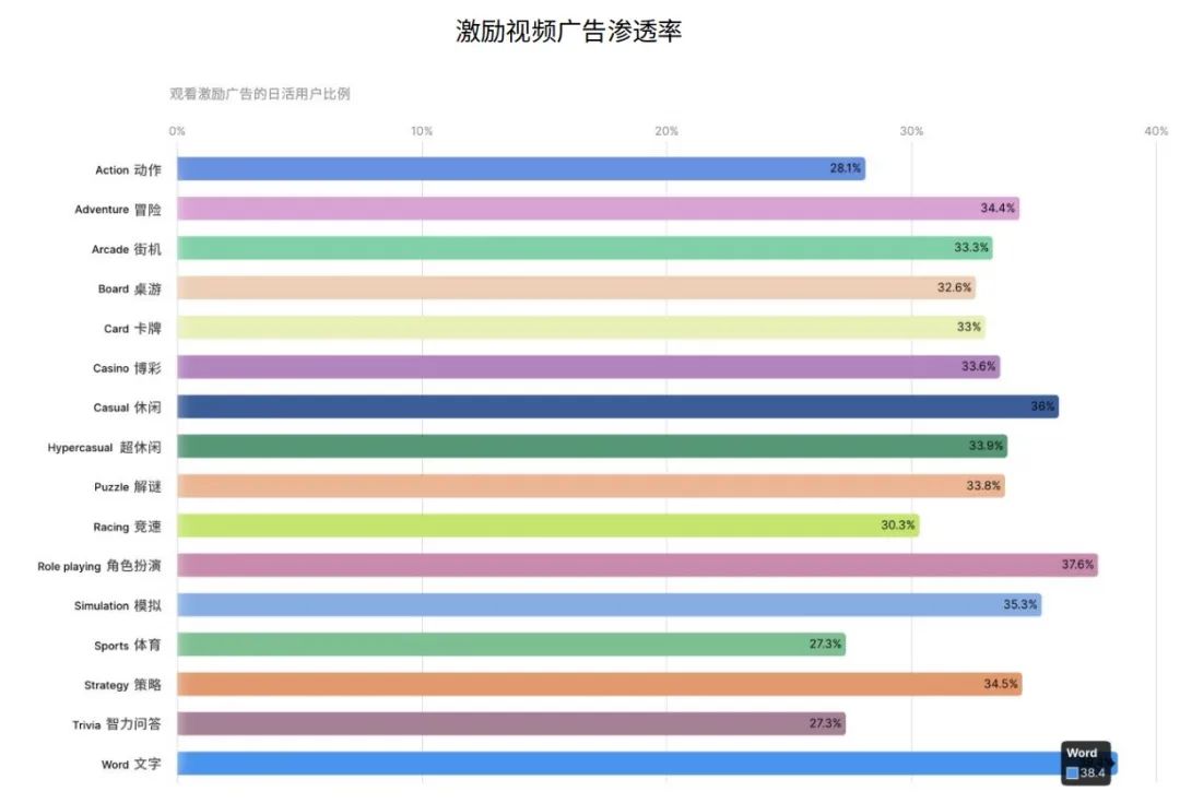 報告數據顯示:Word文字(38.4%)、Role Playing角色扮演(37.6%)和Casual休閒遊戲(36%)是激勵視頻廣告滲透率最高的三個遊戲品類。
