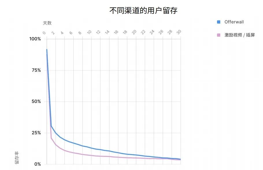 Offerwall的核心優勢體現在數據上是多方面的,首先是留存率,相比於其他廣告Offerwall的留存率高出2-7倍。