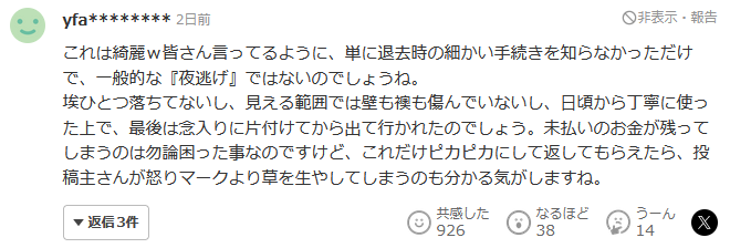 還有人認為,可能這個租客不知道離開的的詳細手續,真正想跑路的人是不會收拾得這麼幹淨的: