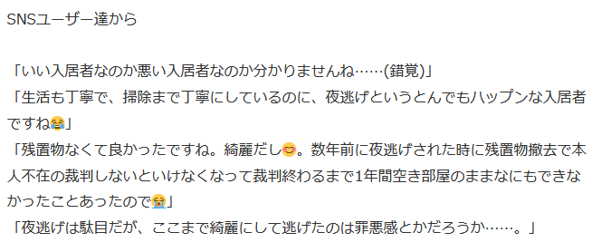 日媒認為,從各方面信息來看,這個租客可能遇到了什麼特殊情況。但不管怎樣,連夜跑路都會給房東增加麻煩,即使沒有拖欠房租和留下垃圾,也是不合適的。