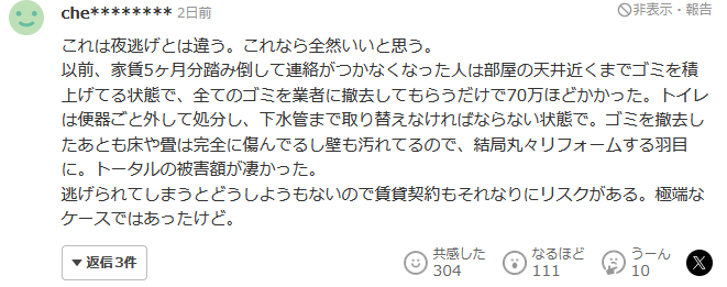 以前,有個租賃5個月的人突然聯繫不到,將垃圾堆到房間天花板附近,只讓人清理所有垃圾,就花了70萬左右。廁所連同馬桶也必須拆下處理,甚至下水管也要更換。清理垃圾後,發現地板和榻榻米也完全損壞,牆壁也很髒,結果只能全部重新裝修。總損失數額驚人。