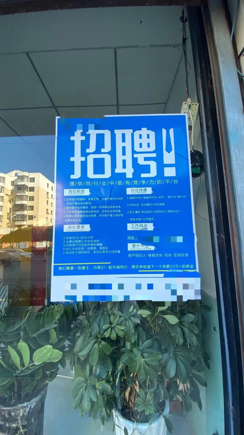 △ 鐵嶺一家房產中介的招聘廣告,崗位待遇為底薪1000元 時代週報 李杭/攝