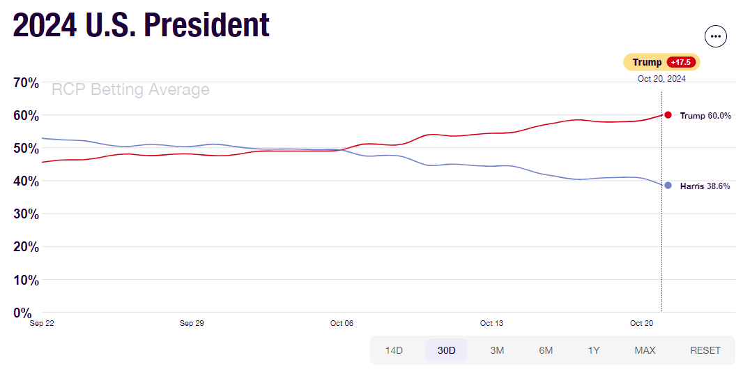 時間上,和搖擺州民調數字高度吻合:兩人到9月末還咬得很近(哈里斯還一度領先),但在10月上旬以來開始出現分化,且兩人的差距加速放大。