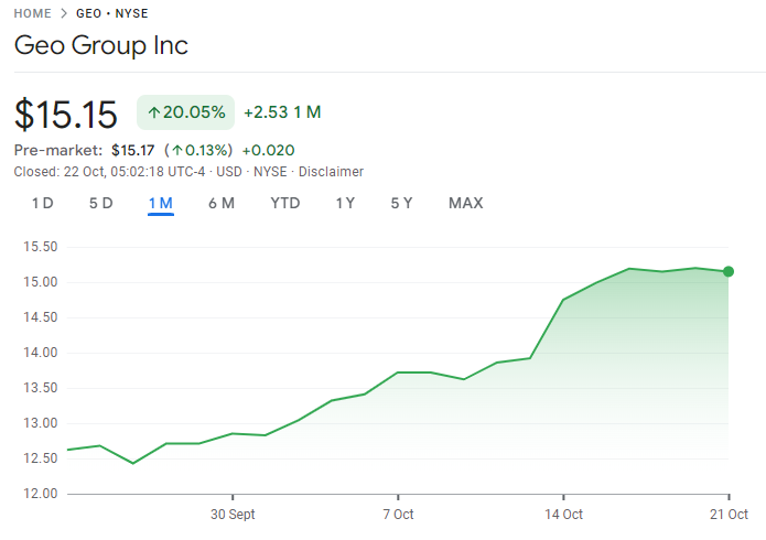 監獄、拘留、收容在美國是一個產業,由私營公司參與運作,並且踏足資本市場,有個上市公司。特朗普聲稱將在上任後加強打擊犯罪,拘留及遣返非法移民,也帶動監獄概念股上漲。龍頭企業GEO Group在過去一個月上漲達20%,説明市場認定特朗普將贏得大選。