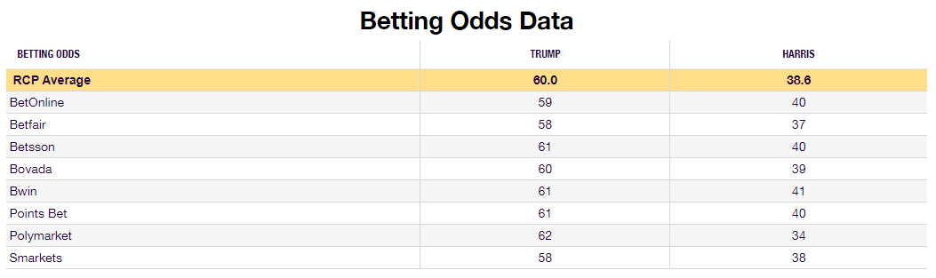 下圖為RCP統計的各大博彩平台的勝率。最新平均值:特朗普勝率60.0%,哈里斯為38.6%。(下圖列出的平台,如Betfair、Polymarket等都是十分常見的,偶而自各種公眾號文章或媒體裏看到)