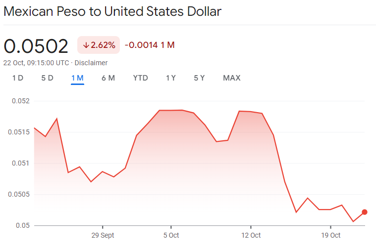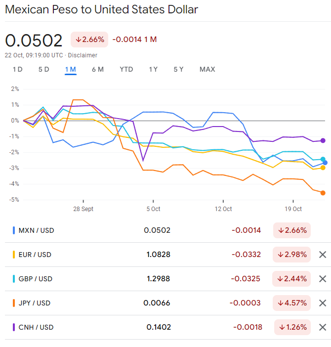 特朗普反覆強調將在上台後對墨西哥大幅提高關税,限制從墨西哥進口產品,其中尤其針對汽車產業(包括投資於墨西哥的美國及中國汽車產業),號稱將關税提高到200%,“不讓一輛汽車從墨西哥進口到美國”。一切都旨在保護及提振美國本土製造業。10月份以來,墨西哥比索較美元顯著貶值,預示市場認為特朗普將贏得大選。