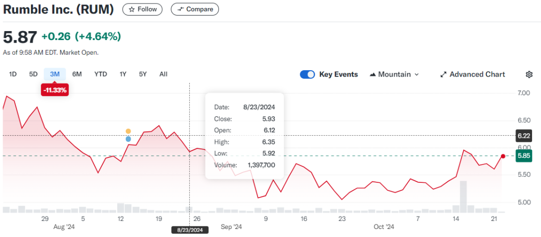 MAGA/右翼的視頻及社交媒體平台,作為對YouTube等左翼/民主黨互聯網大廠社交媒體平台的替代。Peter Thiel、JD萬斯、Vivek Ramaswamy(MAGA政客,曾參加共和黨總統初選)參與早期投資。過去一個月上漲16%。