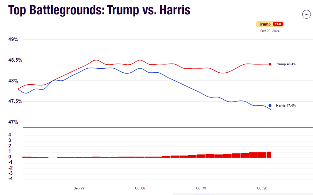 下圖可見,截至九月末,兩個人在搖擺州還咬得很近,但自十月上旬以來開始出現分化,並且趨勢在加強,兩人差距在拉大。