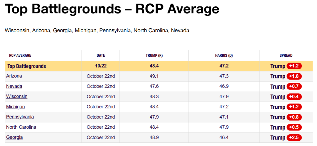 RCP的統合民調數據顯示,特朗普目前在全部七個搖擺州領先(七個搖擺州為威斯康星、亞利桑那、喬治亞、密歇根、賓夕法尼亞、北卡羅來納州、內華達)。
