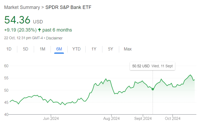 特朗普的一個核心政策主題是“去監管”(deregulation),針對金融行業,提出要去除2008年金融危機之後設置的各種繁雜監管(多為民主黨提出)。因此銀行股也是特朗普政治的風向標。從六月中旬以來,銀行股上漲22%。可以注意到,銀行股的走勢和哈里斯與特朗普的此起彼伏高度相關。哈里斯代替拜登競選,勢頭正好時,銀行股即下跌;9月10日特朗普在與哈里斯的辯論中落敗,銀行股也出現下跌,但十月份以來穩步上漲,預示市場認為特朗普可能當選。