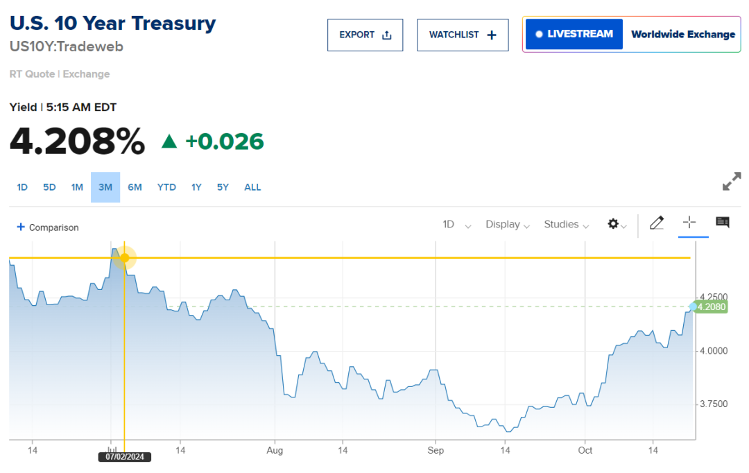 9月18日,美聯儲宣佈大幅減息50個基點。此時,美國十年期國債收益率達到低點。但10月份以來,伴隨特朗普贏得大選的預期增強,收益率開始攀升,達到了降息之前的水平。市場預期,如特朗普上台,將進一步大幅減税,這些政策有利於增長,但也會增加政府赤字,提高中長期的通脹風險。10年期美國國債收益率也隨之上漲,達到了4.2%,回到了降息前的水平。不妨這麼理解,即十年期國債收益率已經假定特朗普贏得大選。