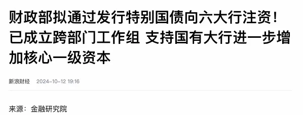 他的原話是,很多銀行淨息差已降至歷史最低。所以12號開會的時候,財政方面時隔26年再次向大型商業銀行注資,規模據説是萬億級別。