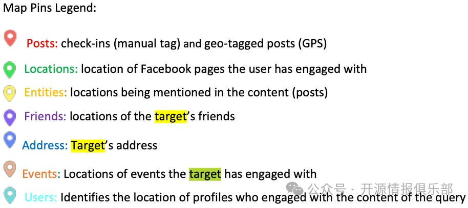 除了Tangles提供每個目標的社交網絡(即他們與之交互的賬户)的可視化之外,2020年培訓手冊還概述瞭如何對用户進行地理監控。目標的可視化位置不僅包括他們的地理標記帖子(在發佈時附加了他們手機的GPS位置),還包括目標的已知地址、他們的“朋友”以及他們已知參加過的任何活動。