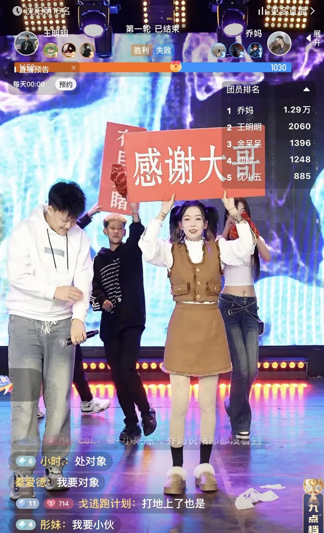 一位名叫“海洋”的用户,在直播間狂刷價值上千元的禮物,直接幫助“喬媽”登上了團隊榜首。其他人順勢改口,叫他“姐夫”。“姐夫”心情好時,還會順手給團隊裏的其他人刷禮物,展現出“大哥”的氣度。