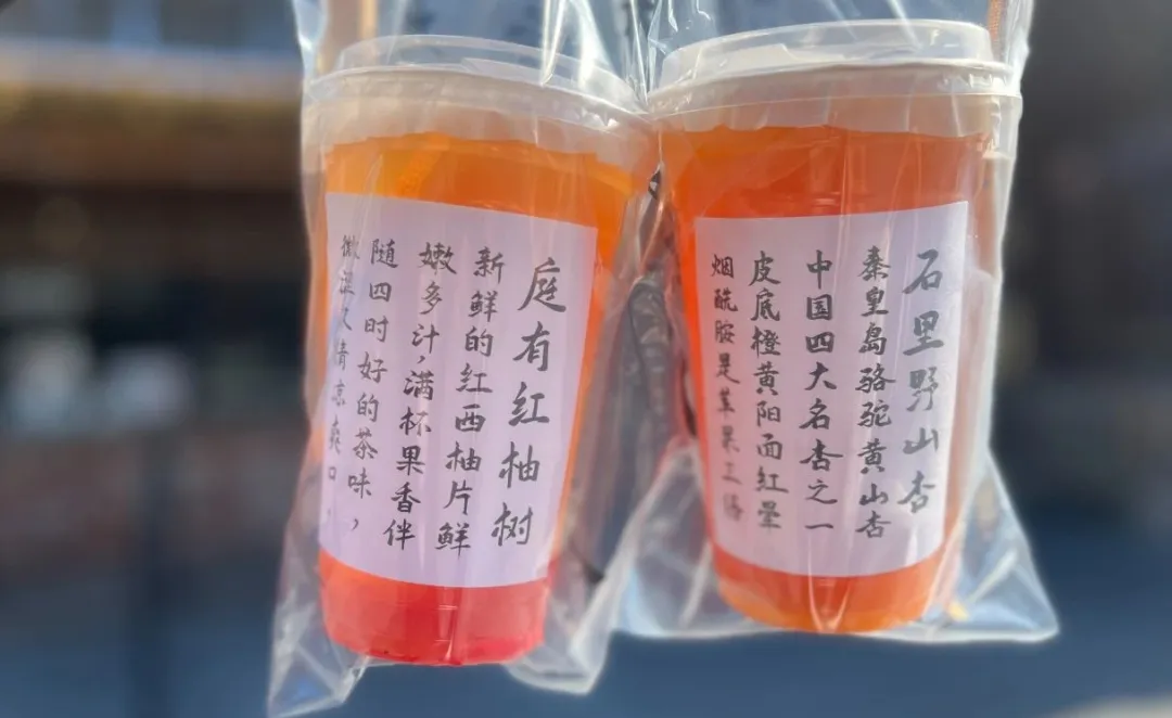 比如石裏野山杏,杯貼上介紹“其煙酰胺是蘋果的三倍”;一畝楂田的杯貼上寫着“鈣是牛肉的八倍,維C是蘋果的十倍”。