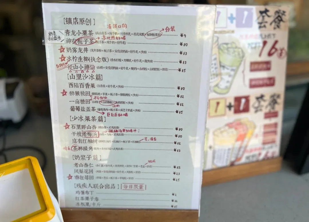 而且,每款飲品都會標明原料來源,在菜單上“手寫”註解,從口感、茶香等給出點單建議。