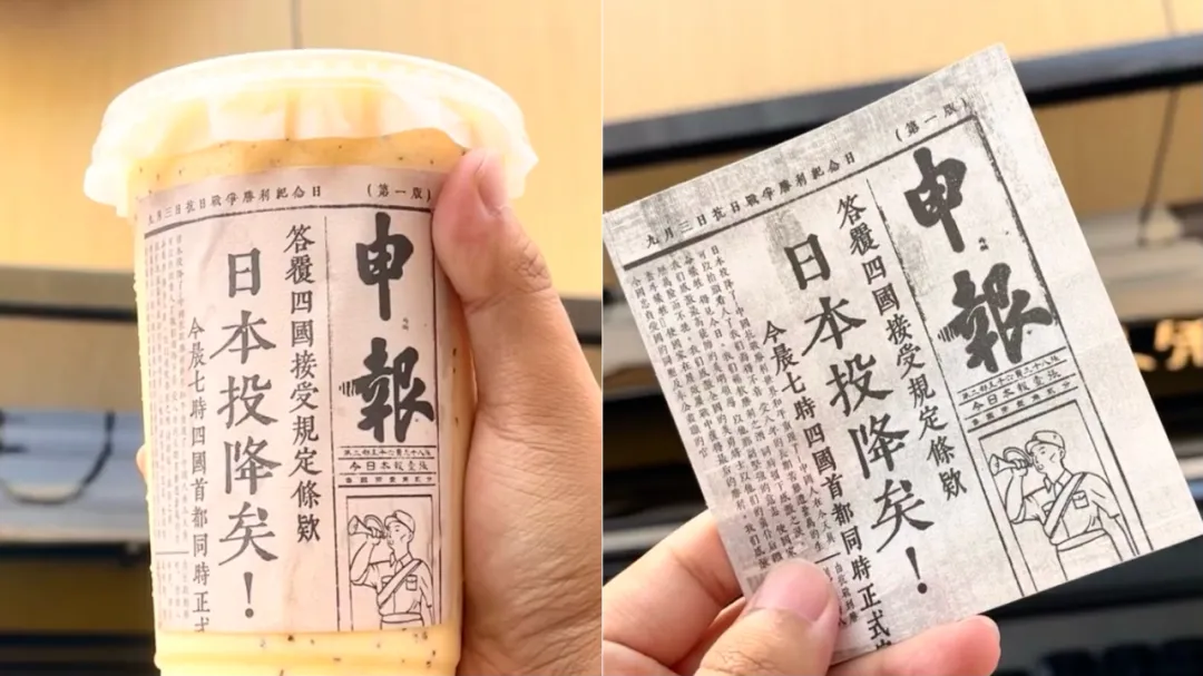 品牌在特定日期會推出系列杯貼或者周邊,十一期間,直接將申報(日本投降)內容做成杯貼,配套貼紙上寫着“我們將望着不在滿目瘡痍的山河感嘆,輕舟已過萬重山。"