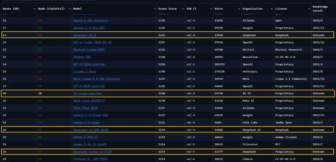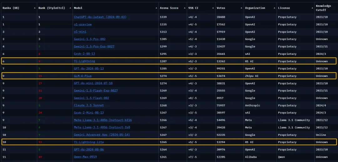 由LMSYS組織的全球大模型競技場(ChatBot Arena)是全球頭部大模型企業同台競技的權威盲測平台。在最新一期的榜單上,依次出現了零一萬物的Yi-Lightning、智譜 AI 的GLM-4-Plus以及DeepSeek V2.5,這些模型都在榜單上取得了出色的成績。