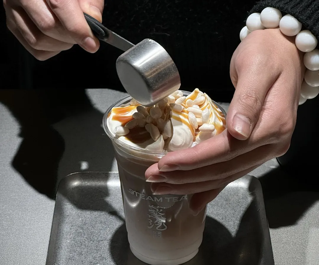 “同樣是買一杯飲品,相比從保温桶裏倒出一杯茶底,很多顧客對經過研磨、萃取、調製的一杯茶底更有好感,就像現做一杯咖啡。” 金聖楠説。