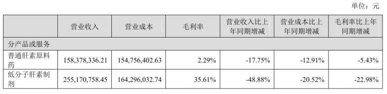 而從業績表現來看,近年來該公司的肝素生意並不好做。財報顯示,今年上半年,常山藥業實現營業收入5.68億元,同比下降30.79%;歸屬淨利潤為-4690.27萬元,扣非淨利潤為-5366.66萬元。產品方面,普通肝素原料藥營收同比下降17.75%,低分子肝素製劑營收同比下降48.88%。
