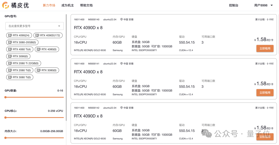 相較於AutoDL,橘皮優提供的算力租賃服務價格更低,適用於對機器配置不敏感的人羣。