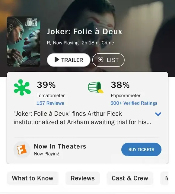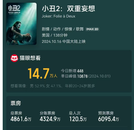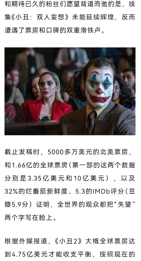 《小丑》第一部的成功無疑是現象級的,無論是票房成績還是獎項,都賺得盆滿缽滿。但是這部續集目前不論在北美還是全球票房都相當糟糕,至於得獎,不得金酸梅獎就不錯了。一部電影的續集遠不如本體本來很正常,但是像《小丑2》這樣的情況還是有點太特殊了,並不是簡單的狗尾續貂就可以解釋的。畢竟,從攝影風格和鏡頭語言來説,這一部延續了前作,從演技來説,華金菲尼克斯也依然保持了很高的水準。