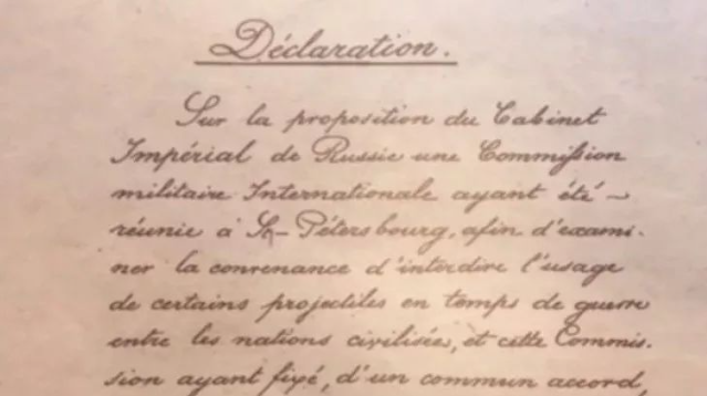1868年,歐洲列強在俄羅斯聖彼得堡簽署了《聖彼得堡宣言》,規定禁止使用重量小於400克的爆炸性射彈,包括爆炸彈、破片彈和燃燒彈。當時,俄羅斯研製出了一種能夠爆炸的步槍子彈,這種恐怖的武器引起了鄰國的恐慌。為了避免造成嚴重影響和軍備競賽,俄羅斯組織歐洲各國談判,準備禁止這種武器的使用。