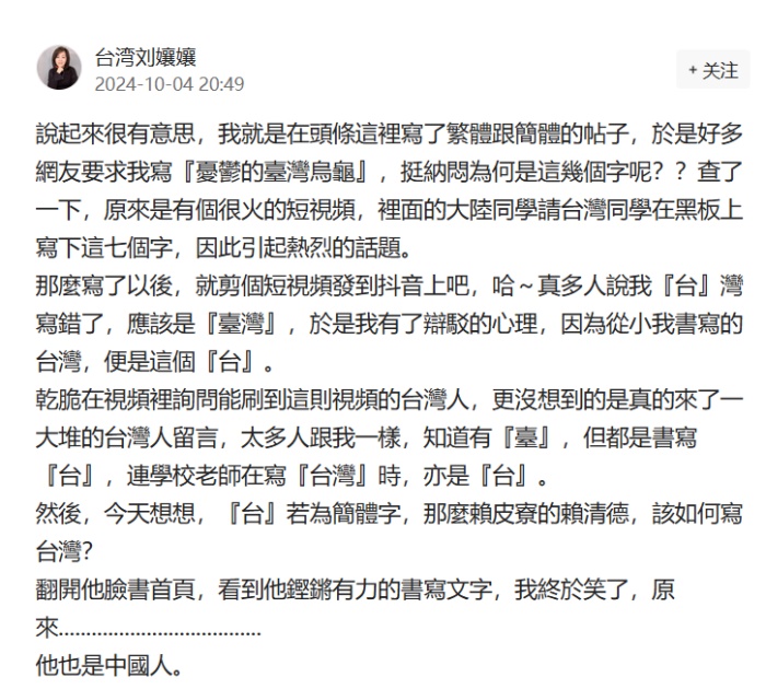 今天看到一個很有趣的短視頻新聞,一位台灣女士在頭條和抖音上談論關於寫繁體字“憂鬱的台灣烏龜”,