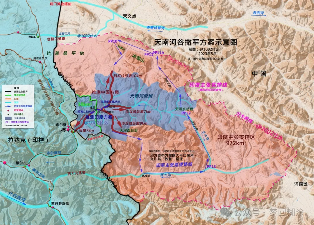 2023年5月,印媒爆出,在中印第18輪軍長級會談中,兩國拿出了實際的撤軍方案。**中方方案是“中脱離”,在該地區設立15~20公里緩衝區(不得巡邏)。基本是雙方同時撤離天南河有通道的區域。****印方方案是“小脱離”**,提出3-4公里的緩衝區(推測下圖藍色線)。