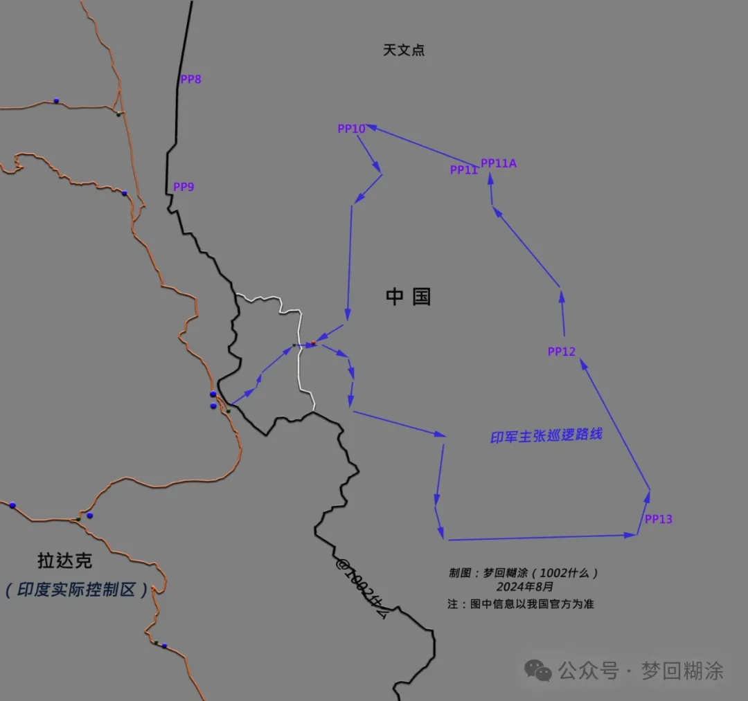 根據印媒的示意圖,其所謂巡邏路線為:ITBP從布爾察河口據點出發,跨過瓶頸,走過Y字路口,往南越過天河西達坂,進入西大溝流域;經乳頭關沿西大溝到北大溝河口(PP13),逆北大溝到天河東達坂(PP12)回到天南河流域;再往北進入奇普恰普河流域,於冰蓮山岔路口打卡PP11A,轉向西分別打卡冰蓮溝東(PP11)、冰蓮溝西(PP10),再折向南翻分水嶺,回到Y字路口,返回布爾察。