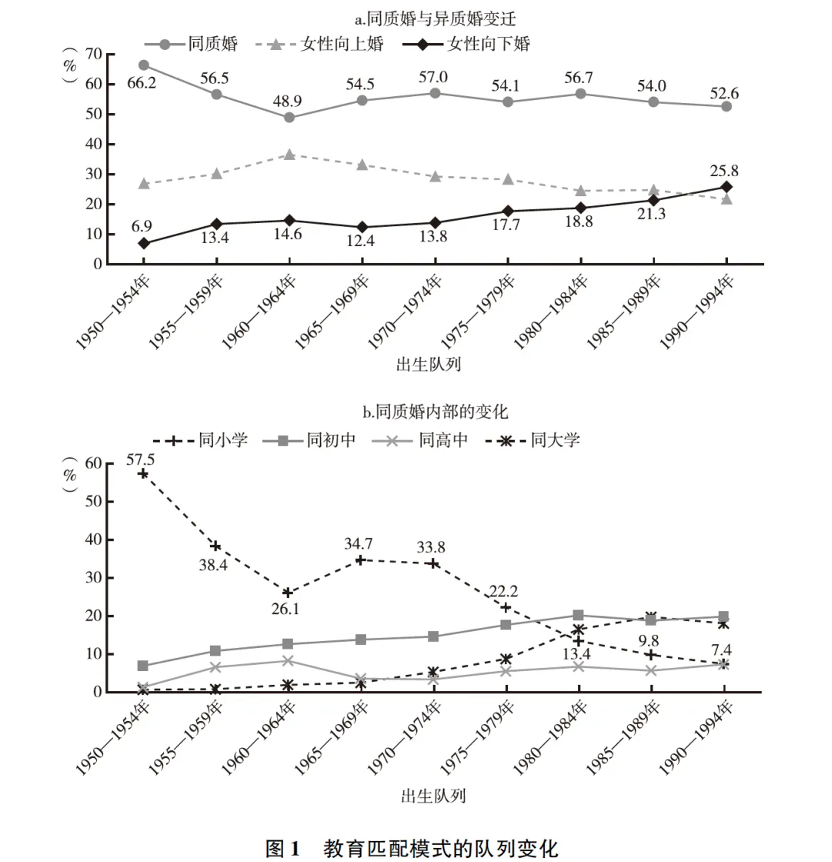 這項研究發現,中國傳統教育“梯度婚”(妻子學歷低於丈夫)正在減少,而高學歷“同質婚”(夫妻雙方學歷一致)和女性“向下婚”(丈夫學歷低於妻子)增多——在最年輕的出生隊列(妻子出生於1990—1994年)中,“梯度婚”的比例已降至21.7%,而女性“向下婚”的比例則增加到了25.8%,2022年的一項研究中也曾發現2014—2018年結婚夫婦中女性“向下婚”佔比已超過“向上婚”。