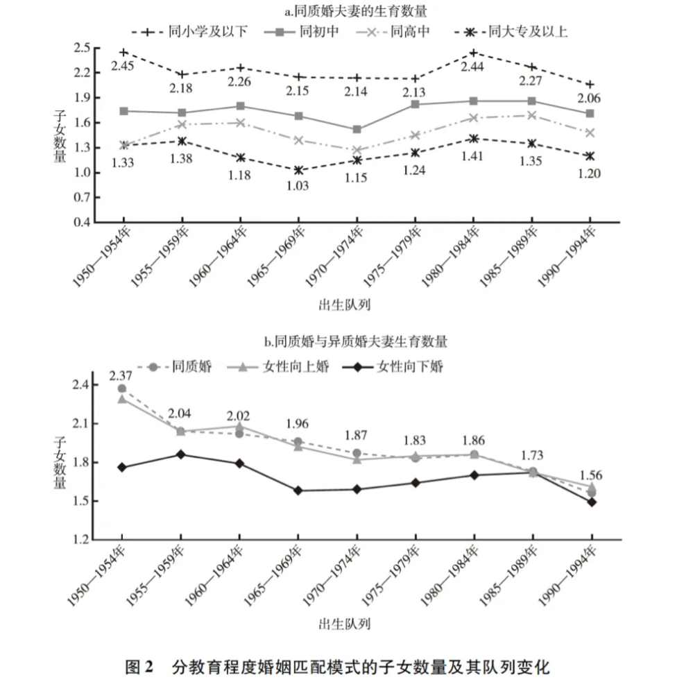 該研究發現,在不同學歷層次的同質婚中,教育與生育之間呈現明顯的負向梯度關係:隨着夫妻受教育水平的提升,生育子女數量逐漸減少。在所有出生隊列中,雙方均為高學歷(大專及以上)的同質婚夫妻的生育水平最低,而受教育程度在小學及以下的夫妻生育水平最高。