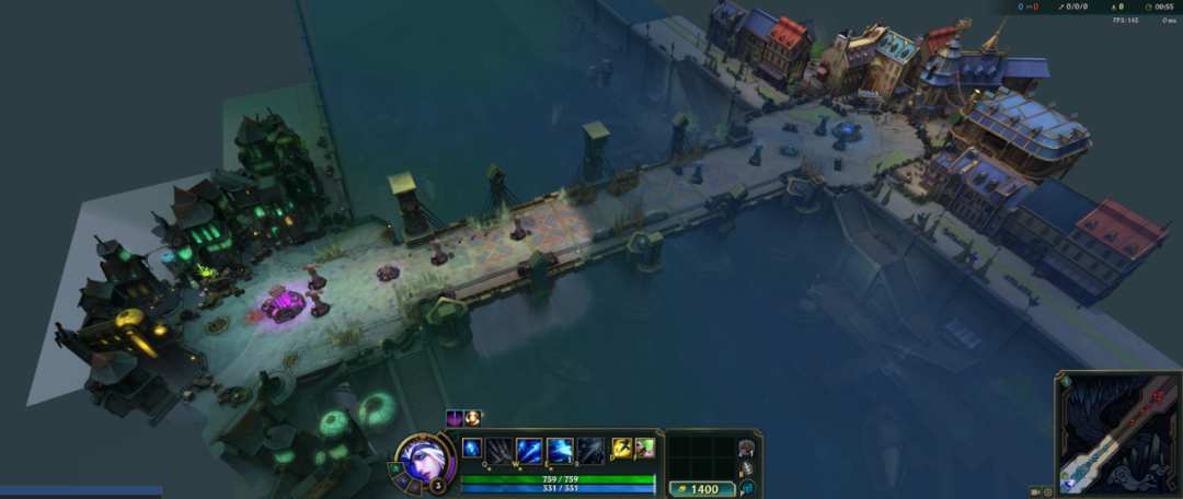 除去大橋之外,兩邊的建築風格、色調、商人NPC等都很有《雙城之戰》的特色,如祖安一方的主色調偏昏暗,以“微光”的紫色作為主題色,而亮堂的皮城則用“海克斯科技”對應的藍色作為主色。