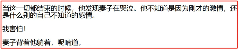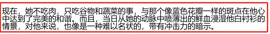 我的眼睛映在地面的血泊中,閃閃地發出兇殘的光芒。這的的確確是我的臉,但是那表情和眼神又如此陌生,恍如初見。我一時也無法説明那種感覺,彷佛這見過無數次的熟悉的臉並不是我的……就是這種活生生的、奇怪而又恐懼的感覺。