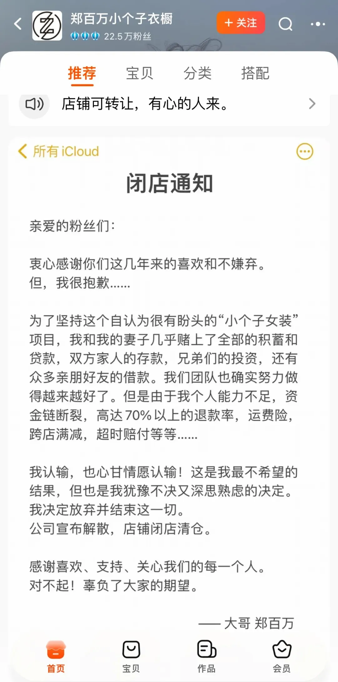 在淘寶的小個子女裝店鋪黑馬榜排名TOP9的店鋪“鄭百萬小個子衣櫥”,近日也宣佈關店了。因為資金鍊斷裂、高達70%的退款率,以及各種賠償罰款等,老闆只能無奈選擇解散公司。