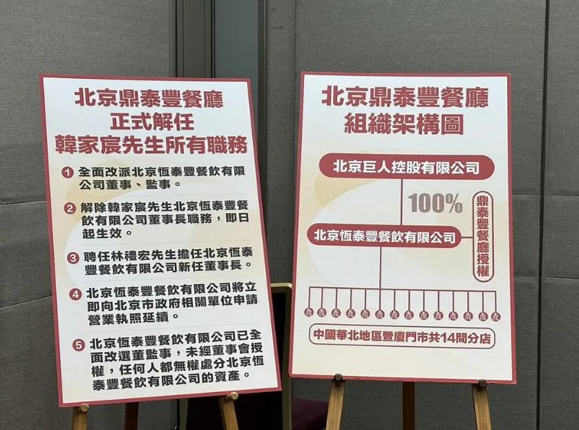 據《中國時報》媒體等報道,北京恆泰豐的股東“北京巨人”方面稱,今年8月26日,北京恆泰豐餐飲原董事長韓家宸逕自宣佈,鼎泰豐華北暨廈門市14家門店10月底熄燈結束營運,此決定未經恆泰豐股東會討論決定,亦未向其母公司“北京巨人”報準,未考量股東之最大利益。
