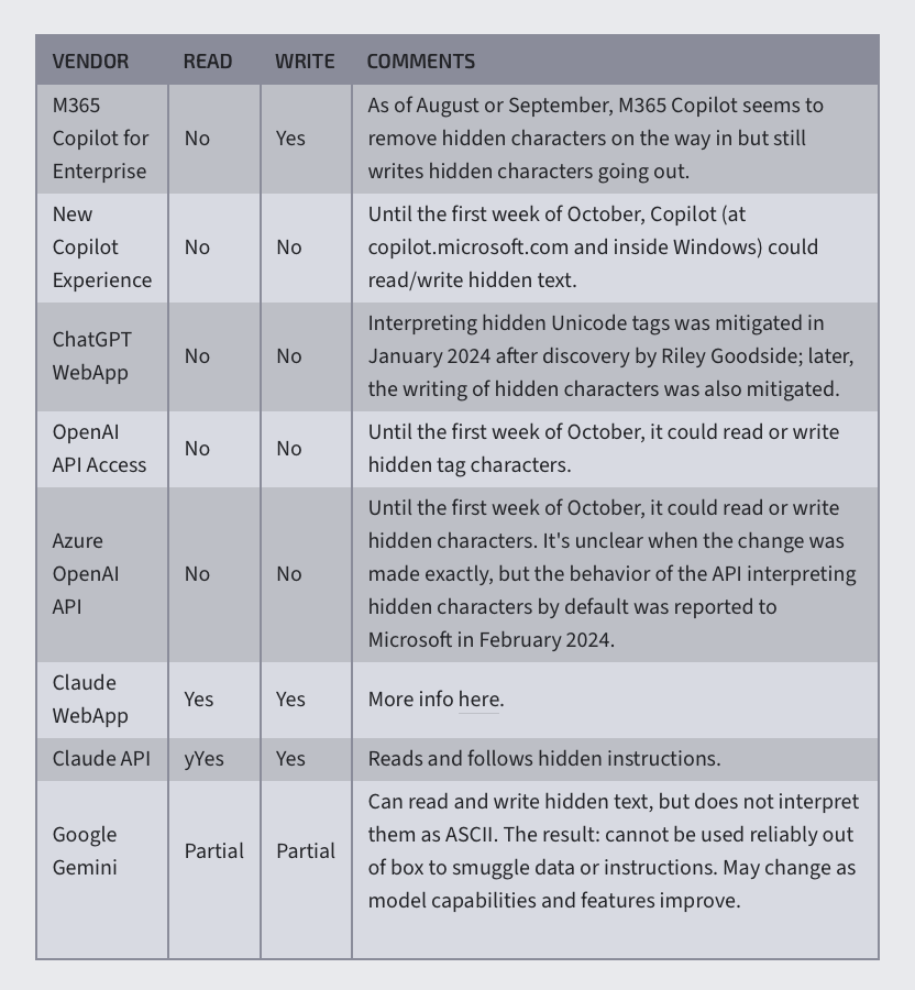 就比如最好騙的當屬 Claude,屬於網絡安全員都上報給開發公司了,工程師都不準備改,因為「還沒發現有任何安全隱患。」;其次是 Gemini,可以讀取到隱藏文本,但判斷不了編碼格式;而像 ChatGPT、Copilot 等其他主流大模型,也在 ASCII 走私這種方式被廣泛披露後,陸陸續續在補漏。