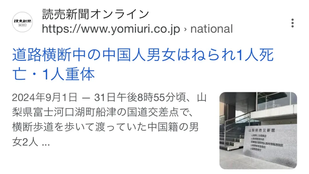 8月31日在富士河口湖町,一位中國籍司機闖紅燈撞倒了正在過馬路的一男一女,兩人均為中國籍人士,最終導致女性當場死亡,男性至今仍然昏迷中,身受重傷。