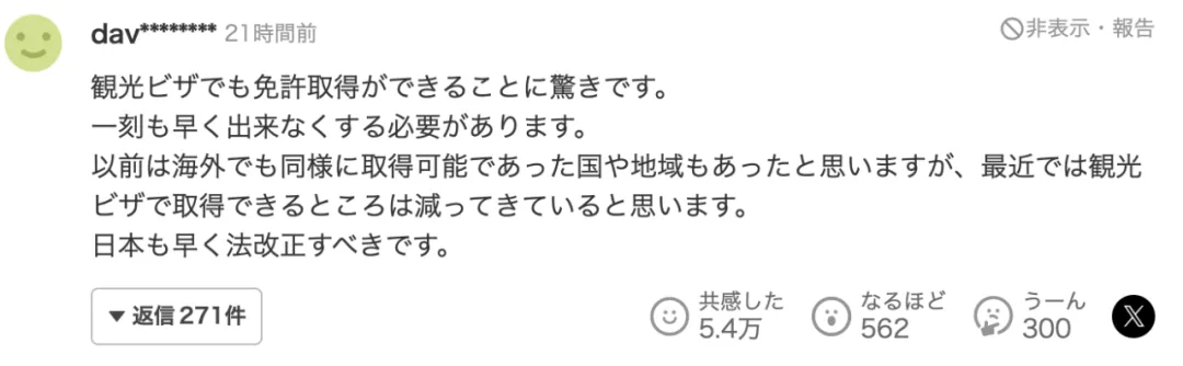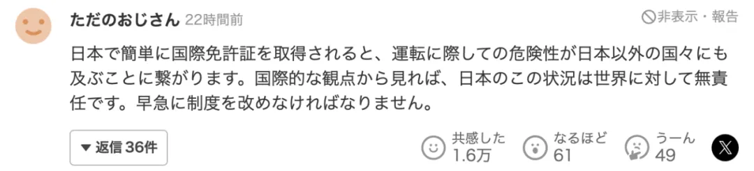 “為什麼旅遊籤也能考駕照啊?真的很震驚。有必要儘快取締這種現象。以前國外有一些地方,也是這樣靠旅遊籤就能考駕照,但是最近允許這樣做的國家以及地區正逐步減少。希望日本也儘快修改相關法律。”